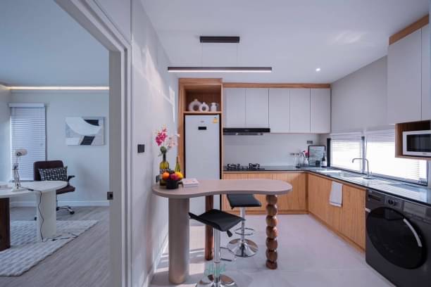 1 ห้องครัว บิวอินฟังก์ชันครบจบ เครื่องซักผ้าอบผ้ารุ่นท็อป ตู้เย็น และไมโครเวฟหน้าบานสีขาวโมเดิร์น เตาแก๊สและฮู้ดดูดควัน