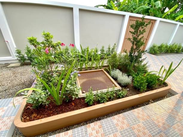อยู่กลางชุมชน มีบ้านเพื่อนบ้านล้อมรอบ พร้อมเสริมกำแพงให้สูงขึ้น ปลอดภัย มีความเป็นส่วนตัวสูง และเรายังเพิ่มพื้นที่ใช้สอย “ภายนอกบ้าน” ให้เยอะจุใจ สวยงาม เข้ากันกับตัวบ้าน